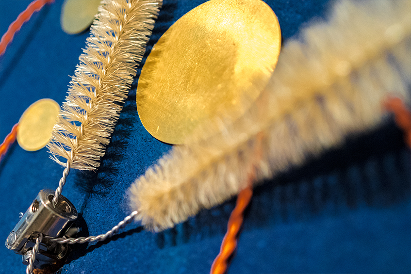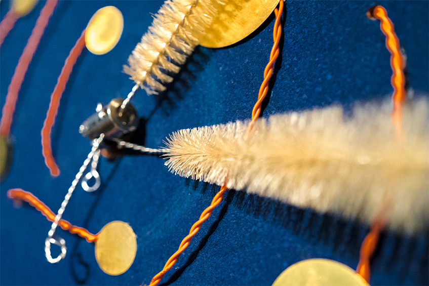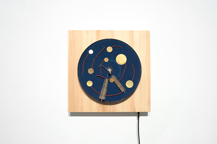 This is a kinetic sound installation with some piezo microphones, there are two metal brushes who attached to the rotational centre, and they are free-floating. When the motor rotates, the brushes are floating around the surface and scratch piezo microphones to generate noise and sound to create a random composition.